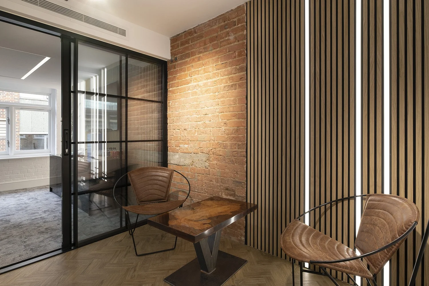 The project involved creating functional spaces across multiple levels: a damp-proofed basement with breakout areas and meeting pods, a ground-floor reception with agile working zones, and upper floors designed for task-based work, boardrooms, and executive suites.